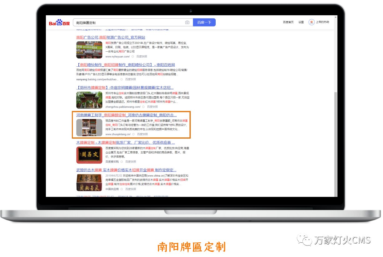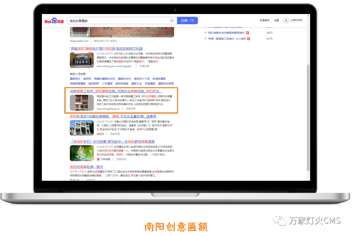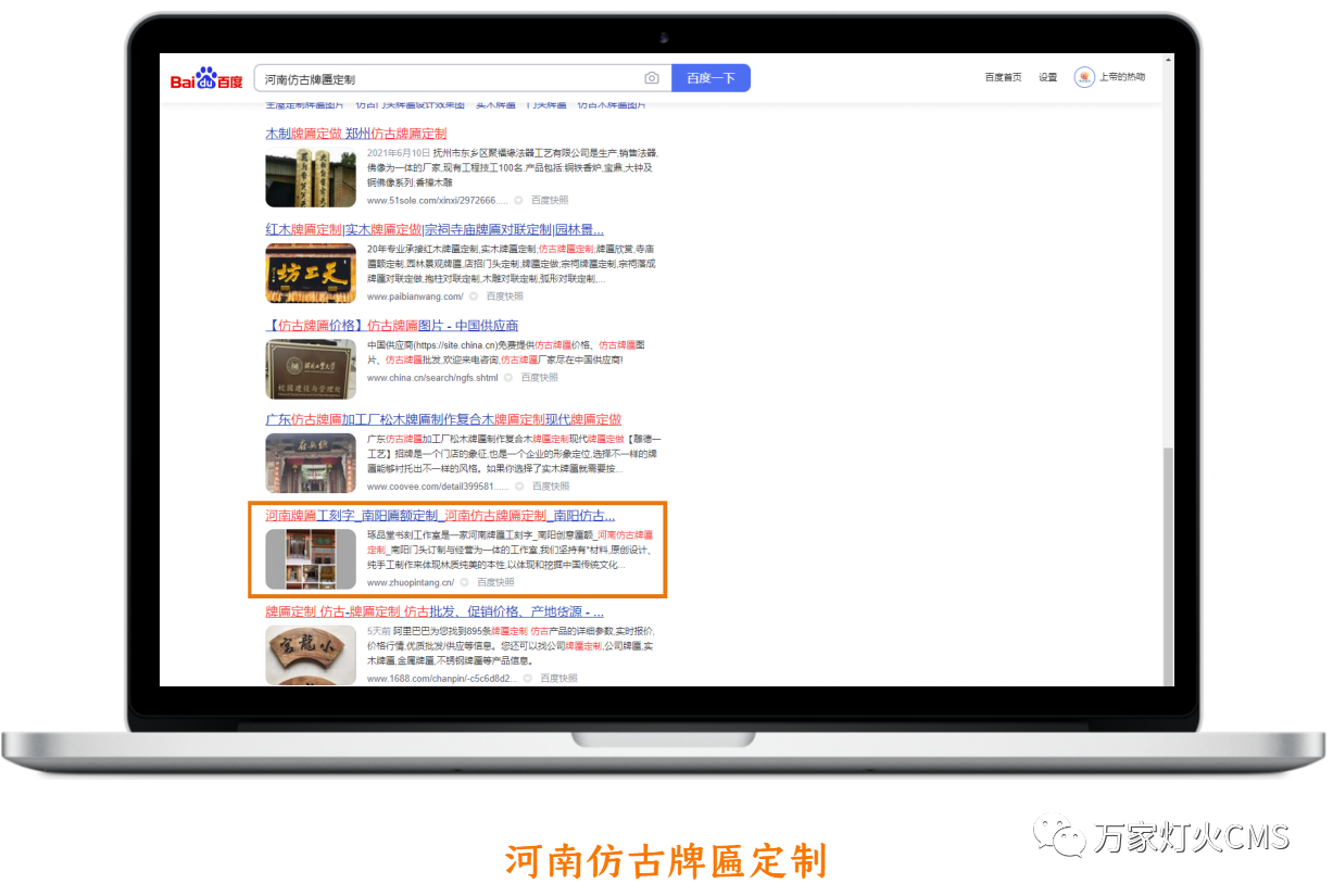 出乎宋總意料之外的是:網(wǎng)站上線兩周,就被百度收錄,且關(guān)鍵詞:河南仿古牌匾、河南仿古牌匾定制、河南門頭牌匾刻字、南陽創(chuàng)意匾額、南陽牌匾定制等關(guān)鍵詞均在百度首頁排名。
