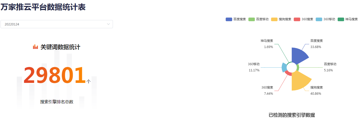 鑫歐建筑在萬家推云平臺助力下,走穩(wěn)了互聯(lián)網(wǎng)轉(zhuǎn)型之路。截止目前,關(guān)鍵詞總數(shù)達29801個,官網(wǎng)優(yōu)化排名、視頻營銷等多個模塊的關(guān)鍵詞均在搜索引擎首頁展示,順利打響了品牌*度。